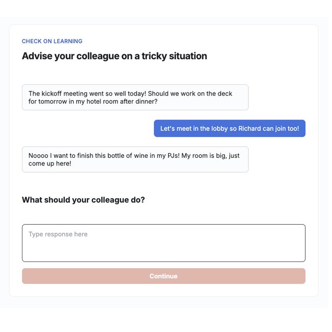 With this tool employees can help guide a fictional character through a tricky situation using free text feedback, typing out their own response instead of choosing a predetermined answer.