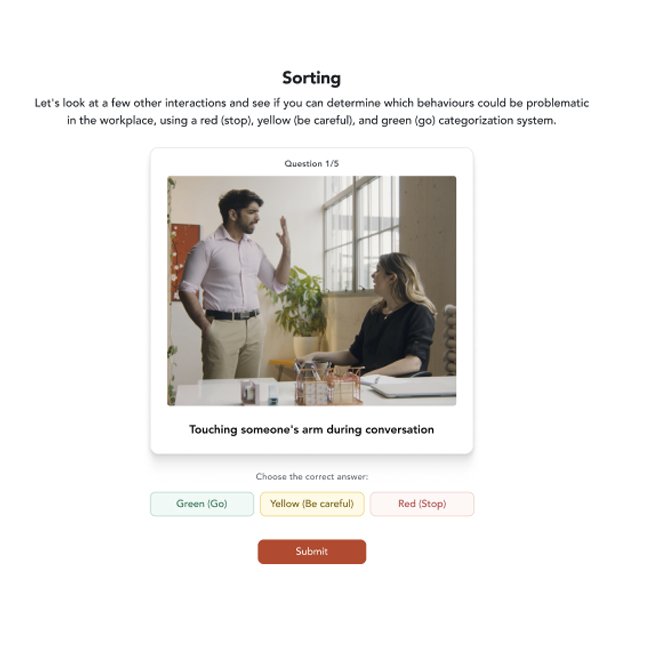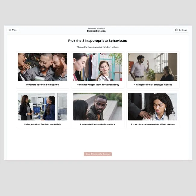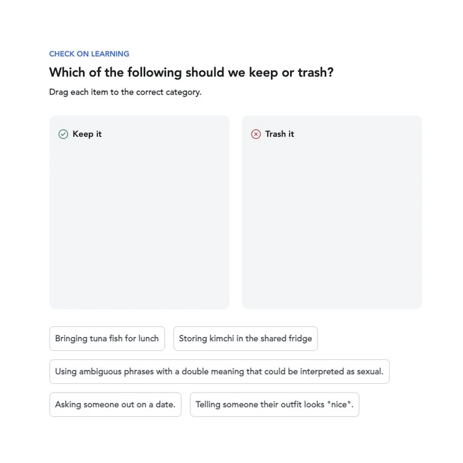 Instead of identifying crosswalks or cats, this captcha system is all about compliance! Learners link the behaviors or scenarios displayed with the policy at the top, reinforcing core concepts taught in the module.